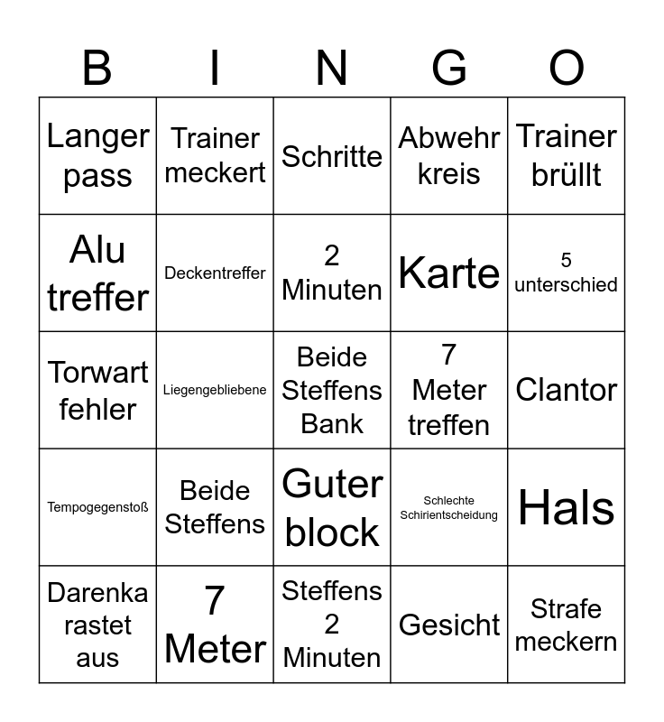 This bingo card has a free space and 24 words: Beide Steffens, 7 Meter, 2 Minuten, Darenka rastet aus, Trainer brüllt, Langer pass, Alu treffer, Trainer meckert, 7 Meter treffen, Guter block, Karte, Torwart fehler, Schlechte Schirientscheidung, Hals, Deckentreffer, Gesicht, Clantor, Schritte, 5 unterschied, Liegengebliebene, Strafe meckern, Tempogegenstoß, Abwehr kreis and Steffens 2 Minuten.