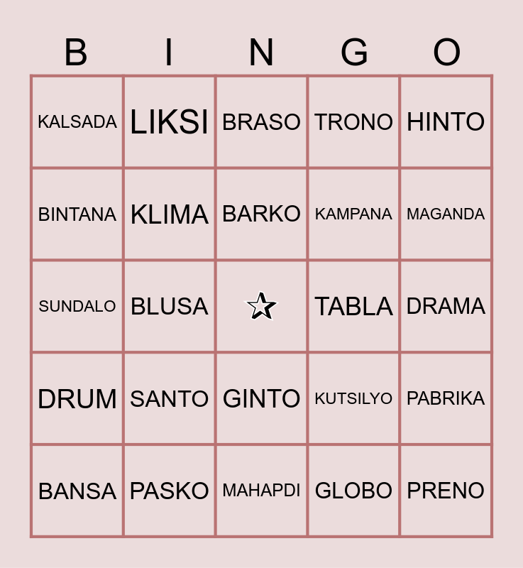 This bingo card has a free space and 24 words: SANTO, PASKO, BARKO, BANSA, HINTO, KALSADA, BINTANA, LIKSI, TABLA, GINTO, KAMPANA, SUNDALO, KUTSILYO, PABRIKA, KLIMA, GLOBO, DRAMA, BRASO, MAGANDA, BLUSA, PRENO, DRUM, TRONO and MAHAPDI.