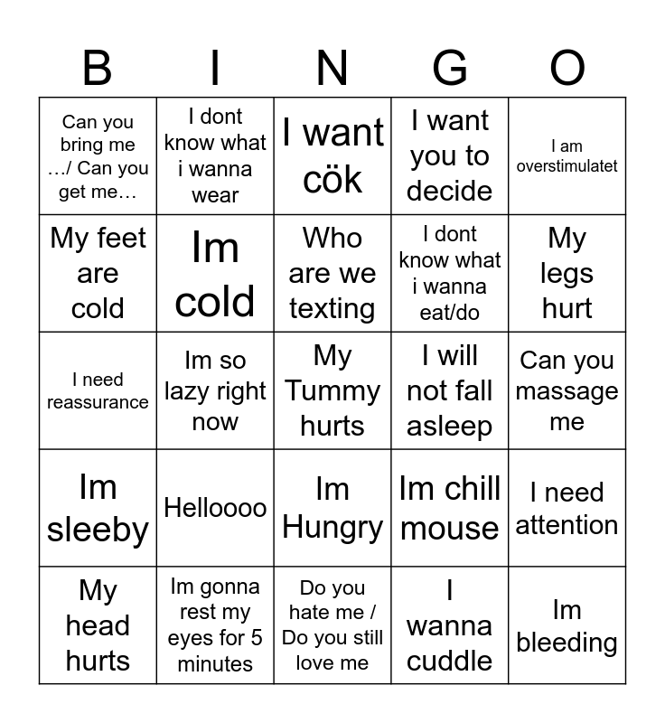 This bingo card has a free space and 24 words: Helloooo, Im gonna rest my eyes for 5 minutes, Who are we texting, My head hurts, I am overstimulatet, Can you bring me …/ Can you get me…, My feet are cold, I dont know what i wanna wear, I will not fall asleep, Im Hungry, I dont know what i wanna eat/do, I need reassurance, Im chill mouse, I need attention, Im cold, I wanna cuddle, Can you massage me, I want cök, My legs hurt, Im so lazy right now, Im bleeding, Im sleeby, I want you to decide and Do you hate me / Do you still love me.