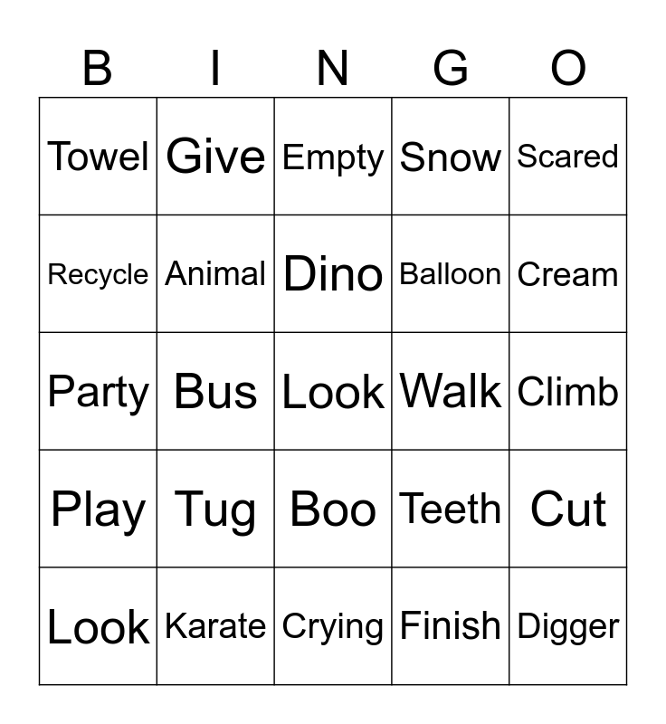 This bingo card has a free space and 97 words: Dark, School, Lunch, Bus, Pets, Write, Elephant, Finger, Roar, Belt, Hop, Shaker, Iguana, Play, Slide, Towel, Scared, Car, Race, Ear, Push, Paint, Skip, Build, Roll, Dino, Look, Cut, Cook, Hang, Animal, Snow, Block, Bike, Crying, Boo, Hurt, Doctor, Jellyfish, Party, Down, Climb, Feeling, Finish, Tug, Jobs, Sick, Worried, Kick, Fire, Bake, Swim, Read, Scoop, Splash, Silly, Train, Give, King, Plant, Zoo, Lick, Brave, Chick, Sleep, Soil, Face, Car, Color, Karate, Balloon, House, Carrot, Drive, Shut, Wash, Baby, Teddy, Walk, Trip, Shark, Cream, Ride, Snorkel, Knee, Shape, Digger, Bath, Show, Police, Empty, Cowboy, Monkey, Teeth, Recycle, Spin and Yay.