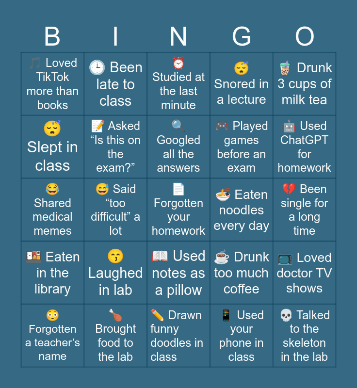 This bingo card has a free space and 24 words: ๐ Laughed in lab, ๐ Brought food to the lab, ๐ Googled all the answers, ๐ณ Forgotten a teacherโs name, ๐ง Drunk 3 cups of milk tea, ๐ต Loved TikTok more than books, ๐ด Slept in class, ๐ Been late to class, ๐ Eaten noodles every day, ๐ Used notes as a pillow, ๐ฎ Played games before an exam, ๐ Shared medical memes, โ Drunk too much coffee, ๐บ Loved doctor TV shows, ๐ Asked โIs this on the exam?โ, ๐ฑ Used your phone in class, ๐ Been single for a long time, โฐ Studied at the last minute, ๐ค Used ChatGPT for homework, ๐ Said โtoo difficultโ a lot, ๐ Talked to the skeleton in the lab, ๐ฑ Eaten in the library, ๐ด Snored in a lecture and โ๏ธ Drawn funny doodles in class.