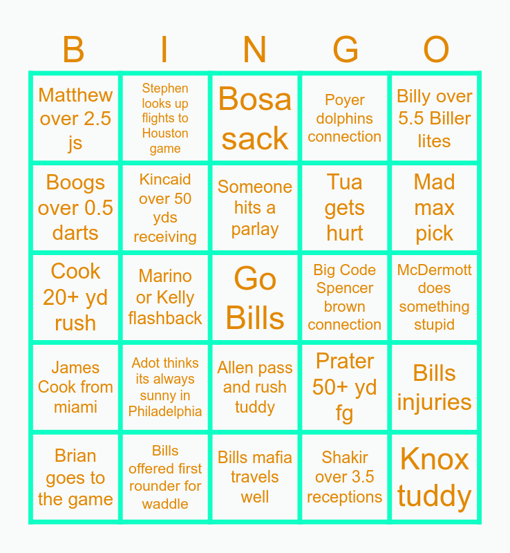 This bingo card has a free space and 24 words: Adot thinks its always sunny in Philadelphia, Bills offered first rounder for waddle, Someone hits a parlay, Brian goes to the game, Billy over 5.5 Biller lites, Matthew over 2.5 js, Boogs over 0.5 darts, Stephen looks up flights to Houston game, Big Code Spencer brown connection, Allen pass and rush tuddy, Tua gets hurt, Cook 20+ yd rush, Prater 50+ yd fg, Bills injuries, Kincaid over 50 yds receiving, Shakir over 3.5 receptions, McDermott does something stupid, Bosa sack, Mad max pick, Marino or Kelly flashback, Knox tuddy, James Cook from miami, Poyer dolphins connection and Bills mafia travels well.