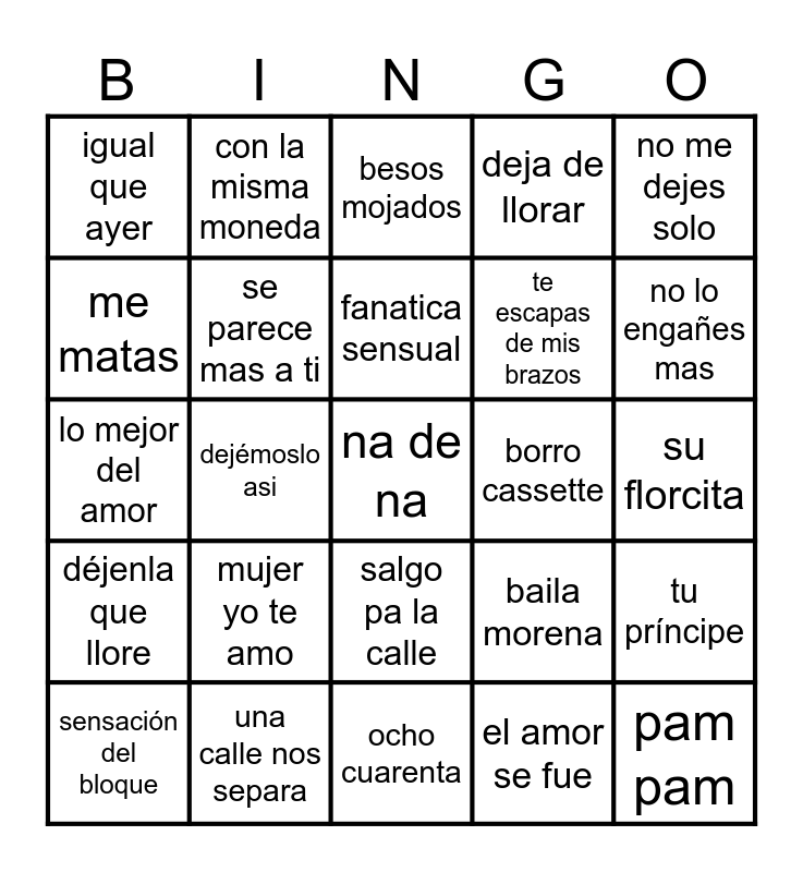 This bingo card has 60 words: yo soy tu maestro, una calle nos separa, amor de chat, déjenla que llore, el amor se fue, vienes y te vas, se parece mas a ti, despojate, te escapas de mis brazos, tramposa y mentirosa, deja de llorar, no te veo, me matas, soy igual que tu, señor de la noche, igual que ayer, na de na, no me dejes solo, more, fanatica sensual, borro cassette, besos mojados, sensación del bloque, tu príncipe, tan solo amantes, soy una gárgola, aparentemente, esta noche de travesuras, no lo engañes mas, me niegas, muero por ti, voy a olvidarme de mi, llegamos los pibes chorros, esa te dejo, con la misma moneda, y se que lloraras, amantes, dejémoslo asi, me pones en tensión, lo mejor del amor, lloraras mas de diez veces, mujer yo te amo, su florcita, si no le contesto, baila morena, permítame, loquita, ojitos chiquititos, díganle, salgo pa la calle, ocho cuarenta, el no va a venir, quizás, ahora, ella y yo, yo voy, MySpace, salió el sol, pam pam and camuflaje.