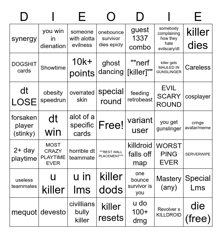 This bingo card has a free space and 48 words: one bounce survivor is you, killer gets MAULED IN GUNSLINGER, killer resets, dt win, overrated skin, cringe avatar/meme, you win in dienation, devesto, somebody complaining how they hate evilscary/dt, """BEST WALL PLACEMENT""", killer dies, onebounce survivor dies epicly, EVIL SCARY ROUND, feeding retrobeast, useless teammates, you get gunslinger, DOGSHIT cards, Careless, Mastery (any), guest 1337 combo, ""nerf [killer]"", alot of a specific cards, synergy, Showtime, Special Lms, 10k+ points, cosplayer, mequot, special round, obesity speedrun, Revolver x KILLDROID, variant user, SERVERWIPE, u killer, forsaken player (stinky), killdroid falls off map, WORST PING EVER, dt LOSE, horrible dt teammate, u in lms, 2+ day playtime, die (free), someone with alotta evilness, civillians bully killer, ghost dancing, killer dods, MOST CRAZY PLAYTIME EVER and u do 100+ dmg.