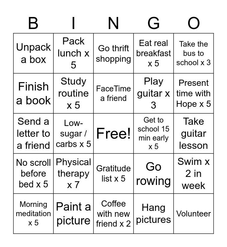 This bingo card has a free space and 24 words: Physical therapy x 7, Paint a picture, FaceTime a friend, Morning meditation x 5, Take the bus to school x 3, Unpack a box, Finish a book, Pack lunch x 5, Get to school 15 min early x 5, Gratitude list x 5, Play guitar x 3, Send a letter to a friend, Go rowing, Swim x 2 in week, Study routine x 5, Hang pictures, Take guitar lesson, Go thrift shopping, Present time with Hope x 5, Low-sugar / carbs x 5, Volunteer, No scroll before bed x 5, Eat real breakfast x 5 and Coffee with new friend x 2.