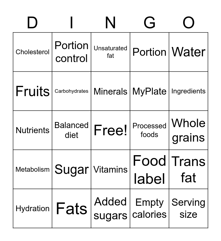 This bingo card has a free space and 40 words: Calories, Nutrients, Protein, Carbohydrates, Fats, Vitamins, Minerals, Fiber, Water, Metabolism, Balanced diet, Portion, Serving size, Whole grains, Processed foods, Sugar, Sodium, Cholesterol, Saturated fat, Unsaturated fat, Trans fat, Empty calories, MyPlate, Fruits, Vegetables, Dairy, Protein foods, Grains, Calories in, Calories out, Energy balance, Hydration, Nutrient-dense, Food label, Ingredients, Added sugars, Daily value, Moderation, Portion control and Malnutrition.
