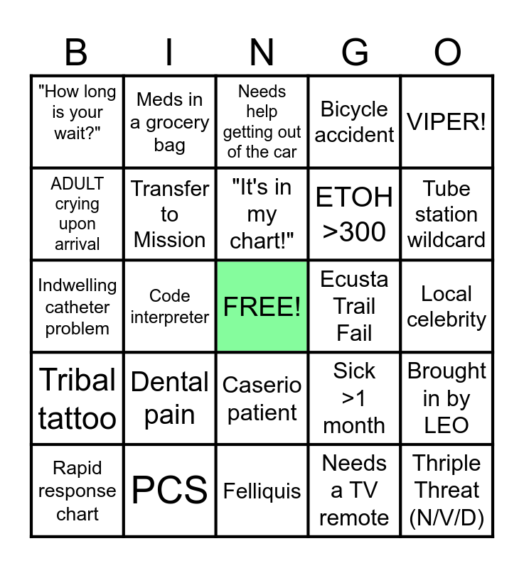 This bingo card has a free space and 24 words: Dental pain, PCS, "It's in my chart!", Rapid response chart, VIPER!, "How long is your wait?", ADULT crying upon arrival, Meds in a grocery bag, Ecusta Trail Fail, Caserio patient, ETOH >300, Indwelling catheter problem, Sick >1 month, Brought in by LEO, Transfer to Mission, Needs a TV remote, Local celebrity, Needs help getting out of the car, Tube station wildcard, Code interpreter, Thriple Threat (N/V/D), Tribal tattoo, Bicycle accident and Felliquis.
