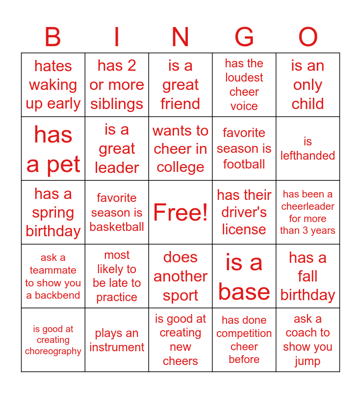This bingo card has 39 words: has great facials, has a summer birthday, has the best jumps, is a great leader, is good at creating choreography, does another sport, wants to cheer in college, is a backspot, is an only child, ask a teammate to show you a backbend, favorite season is basketball, has the loudest cheer voice, Free!, has been a cheerleader for more than 3 years, has their driver's license, most likely to be late to practice, can do a back handspring, hates waking up early, has the same shoe size as you, is a base, has a pet, is good at creating new cheers, favorite season is football, is lefthanded, has traveled out of the country, ask a teammate to show you a jump, ask a coach to show you jump, has a winter birthday, can whistle, has 2 or more siblings, ask a teammate to do 5 push ups, owns 3 or more cheer bows, is a great friend, plays an instrument, has done competition cheer before, has a great smile, has a fall birthday, has a spring birthday and is a flyer.