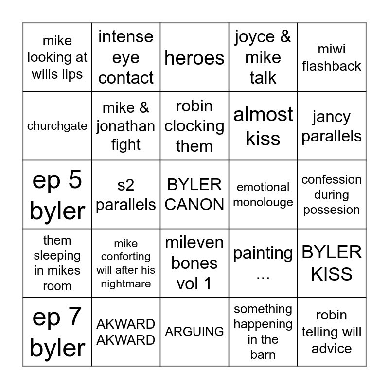 This bingo card has a free space and 24 words: mike conforting will after his nightmare, AKWARD AKWARD, robin clocking them, ep 7 byler, miwi flashback, mike looking at wills lips, churchgate, intense eye contact, emotional monolouge, mileven bones vol 1, almost kiss, ep 5 byler, painting ..., BYLER KISS, mike & jonathan fight, something happening in the barn, confession during possesion, heroes, jancy parallels, s2 parallels, robin telling will advice, them sleeping in mikes room, joyce & mike talk and ARGUING.