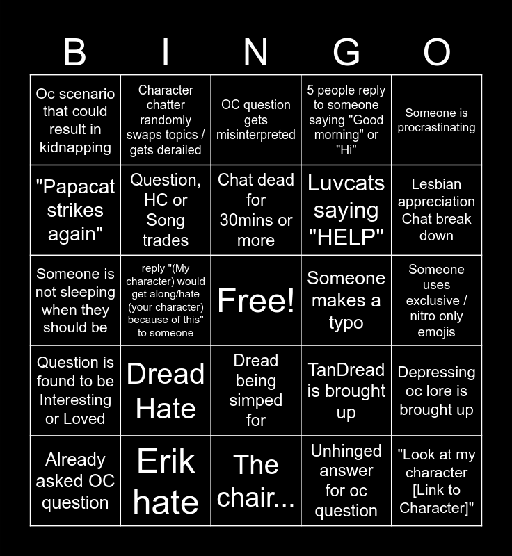 This bingo card has a free space and 24 words: Dread Hate, Erik hate, Chat dead for 30mins or more, Already asked OC question, Someone is procrastinating, Oc scenario that could result in kidnapping, "Papacat strikes again", Character chatter randomly swaps topics / gets derailed, Someone makes a typo, Dread being simped for, Luvcats saying "HELP", Someone is not sleeping when they should be, TanDread is brought up, Depressing oc lore is brought up, Question, HC or Song trades, Unhinged answer for oc question, Someone uses exclusive / nitro only emojis, OC question gets misinterpreted, Lesbian appreciation Chat break down, reply "(My character) would get along/hate (your character) because of this" to someone, "Look at my character [Link to Character]", Question is found to be Interesting or Loved, 5 people reply to someone saying "Good morning" or "Hi" and The chair....