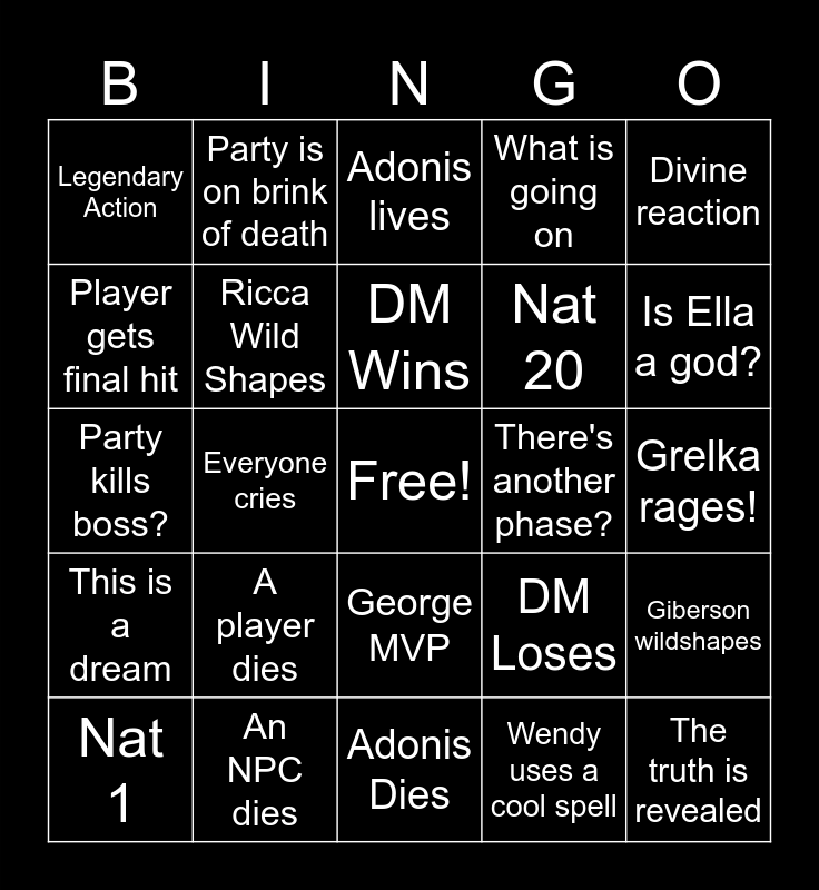 This bingo card has a free space and 24 words: A player dies, An NPC dies, DM Wins, Nat 1, Divine reaction, Legendary Action, Player gets final hit, Party is on brink of death, There's another phase?, George MVP, Nat 20, Party kills boss?, DM Loses, Giberson wildshapes, Ricca Wild Shapes, Wendy uses a cool spell, Grelka rages!, Adonis lives, Is Ella a god?, Everyone cries, The truth is revealed, This is a dream, What is going on and Adonis Dies.