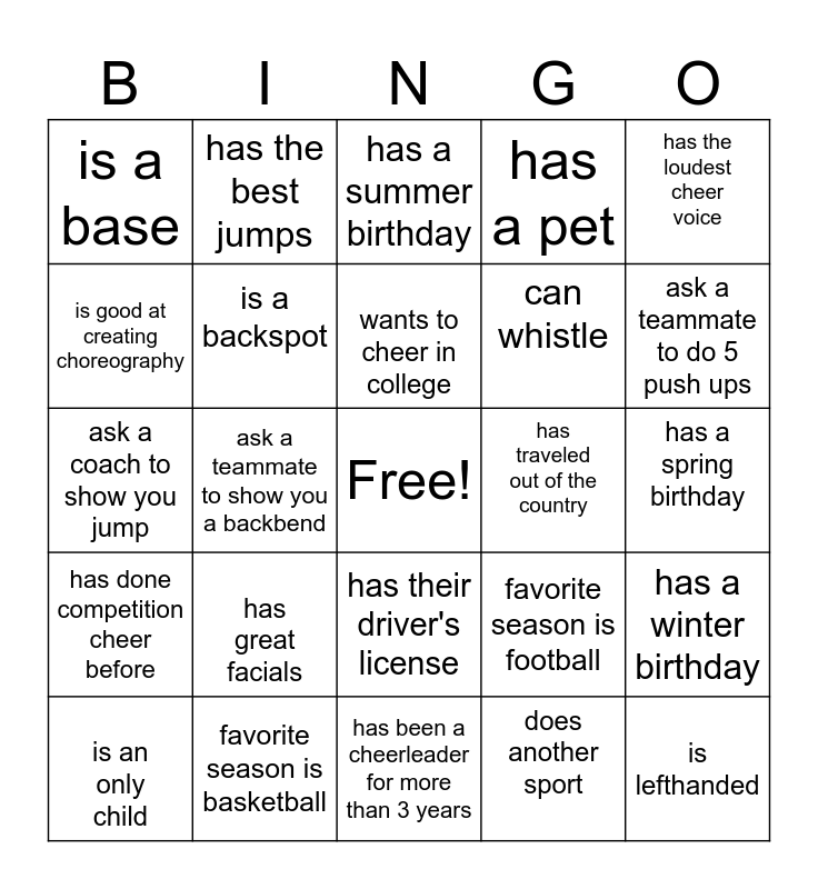 This bingo card has 39 words: owns 3 or more cheer bows, plays an instrument, has a fall birthday, is a backspot, is an only child, has their driver's license, wants to cheer in college, is a flyer, has the loudest cheer voice, has done competition cheer before, ask a teammate to show you a backbend, has a pet, Free!, has a spring birthday, has traveled out of the country, has great facials, is good at creating new cheers, is a base, has 2 or more siblings, favorite season is football, is good at creating choreography, has been a cheerleader for more than 3 years, can whistle, ask a teammate to do 5 push ups, Is a great leader, has the same shoe size as you, is lefthanded, hates waking up early, most likely to be late to practice, has the best jumps, can do a back handspring, has a great smile, has a summer birthday, favorite season is basketball, does another sport, is a great friend, has a winter birthday, ask a coach to show you jump and ask a teammate to show you a jump.
