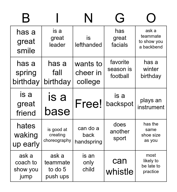 This bingo card has a free space and 38 words: has done competition cheer before, is good at creating new cheers, has the loudest cheer voice, has a fall birthday, has the same shoe size as you, is good at creating choreography, wants to cheer in college, has their driver's license, ask a teammate to show you a backbend, favorite season is football, is a base, has great facials, most likely to be late to practice, plays an instrument, has a spring birthday, hates waking up early, has the best jumps, is lefthanded, owns 3 or more cheer bows, is a backspot, has a great smile, ask a teammate to do 5 push ups, has a winter birthday, ask a coach to show you jump, has 2 or more siblings, is an only child, has a pet, has been a cheerleader for more than 3 years, has a summer birthday, has traveled out of the country, is a flyer, can do a back handspring, can whistle, is a great leader, favorite season is basketball, does another sport, is a great friend and ask a teammate to show you a jump.