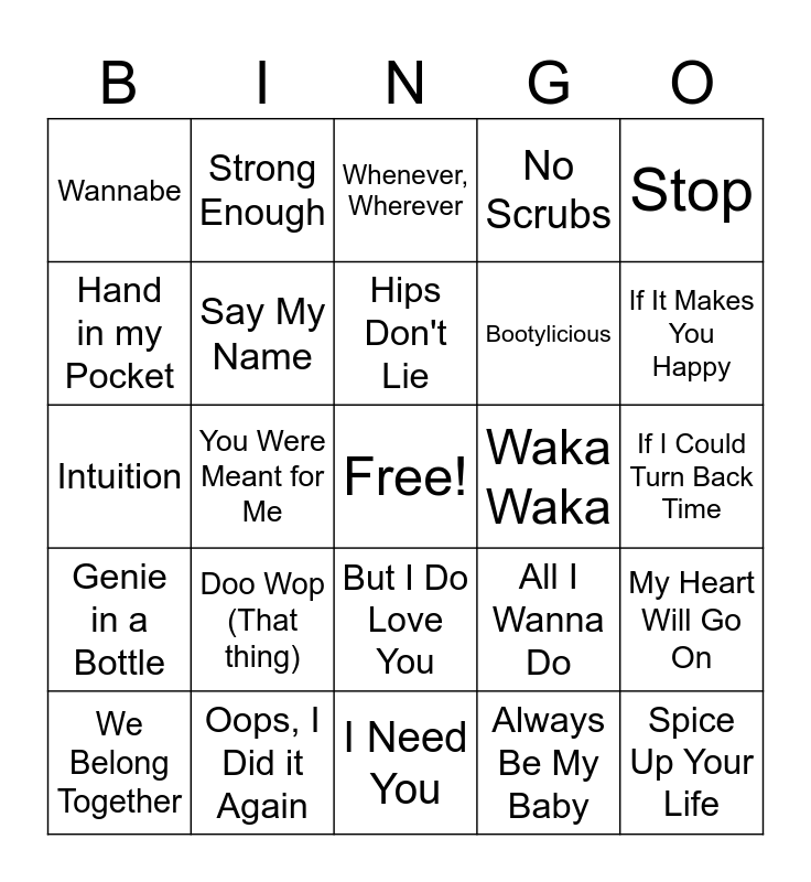 This bingo card has a free space and 62 words: Baby One More Time, Oops, I Did it Again, I'm a Slave for You, Genie in a Bottle, Come on Over, What a Girl Wants, Say My Name, Survivor, Bootylicious, Waterfalls, No Scrubs, Ironic, Hand in my Pocket, You Otta Know, One in a Million, Wannabe, Spice Up Your Life, Stop, Say You'll Be There, Hips Don't Lie, Waka Waka, Whenever, Wherever, We Belong Together, Always Be My Baby, Fantasy, Heartbreaker (Mariah Carey), Shake if Off (Mariah Carey), It's All Coming Back To Me, My Heart Will Go On, That's the Way It is, Come to my window, Can't Get you Out of my Head, Why Can't I?, Believe, If I Could Turn Back Time, Strong Enough, Building a Mystery, I Will Remember You, You Were Meant for Me, Who Will Save Your Soul, Intuition, The Boy is Mine, Doo Wop (That thing), Killing Me Softly, If It Makes You Happy, All I Wanna Do, Soak Up the Sun, The First Cut is the Deepest, Can't Fight the Moonlight, The Right Kind of Wrong, But I Do Love You, I Need You, Man! I Feel Like a Woman, You're Still the One, That Don't Impress Me Much, Up, I Wanna Dance with Somebody, It's Not Right, But It's Okay, How Will I Know, I Will Always Love You, Someone to Call My Lover and All for You.