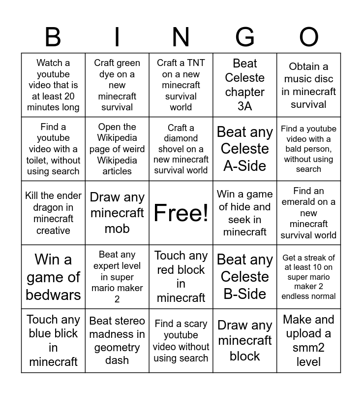 This bingo card has a free space and 27 words: Beat any Celeste B-Side, Beat any Celeste C-Side, Beat any Celeste A-Side, Find a scary youtube video without using search, Find a youtube video with a toilet, without using search, Craft a TNT on a new minecraft survival world, Craft green dye on a new minecraft survival, Win a game of bedwars, Win a game of hide and seek in minecraft, Get a streak of at least 10 on super mario maker 2 endless normal, Kill the ender dragon in minecraft creative, Beat Celeste chapter 3A, Touch any blue blick in minecraft, Beat stereo madness in geometry dash, Find a youtube video with a bald person, without using search, Find a youtube video with a pizza, without using search, Open the Wikipedia page of weird Wikipedia articles, Craft a diamond shovel on a new minecraft survival world, Beat any expert level in super mario maker 2, Watch a youtube video that is at least 20 minutes long, Find an emerald on a new minecraft survival world, Draw any minecraft block, Draw any minecraft mob, Make and upload a smm2 level, Touch any red block in minecraft, Obtain a music disc in minecraft survival and Beat back on track in geometry dash.