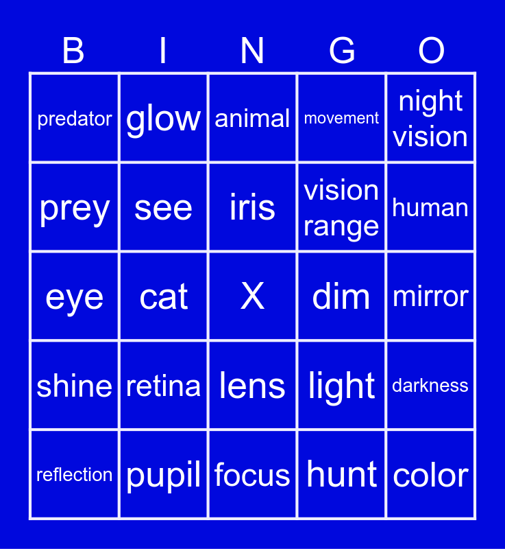 This bingo card has a free space and 24 words: retina, pupil, iris, reflection, night vision, predator, prey, glow, dim, lens, vision range, eye, light, darkness, see, hunt, mirror, animal, human, cat, color, shine, movement and focus.