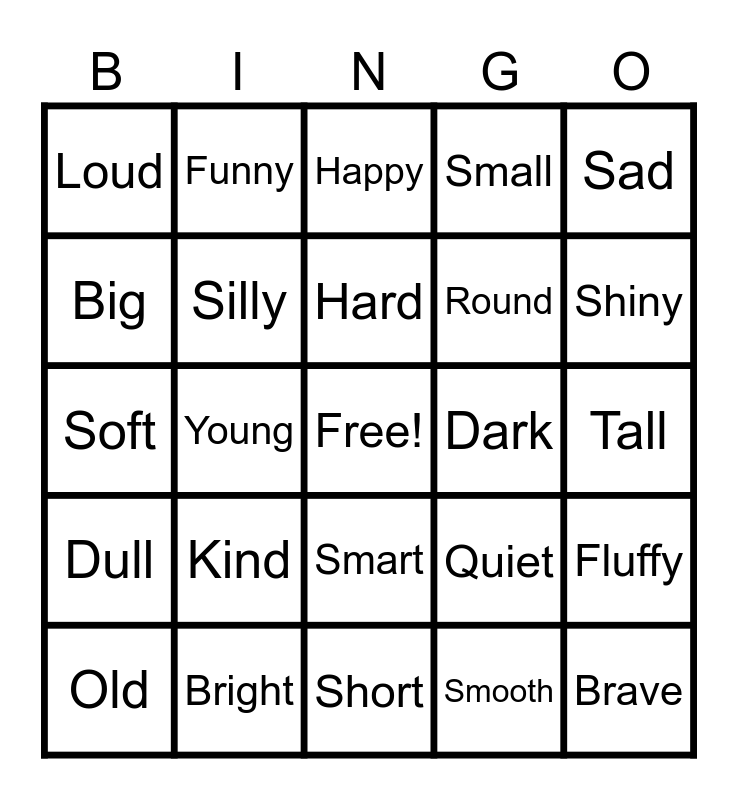This bingo card has a free space and 24 words: Kind, Bright, Hard, Old, Sad, Loud, Big, Funny, Dark, Smart, Round, Soft, Quiet, Fluffy, Silly, Smooth, Tall, Happy, Shiny, Young, Brave, Dull, Small and Short.