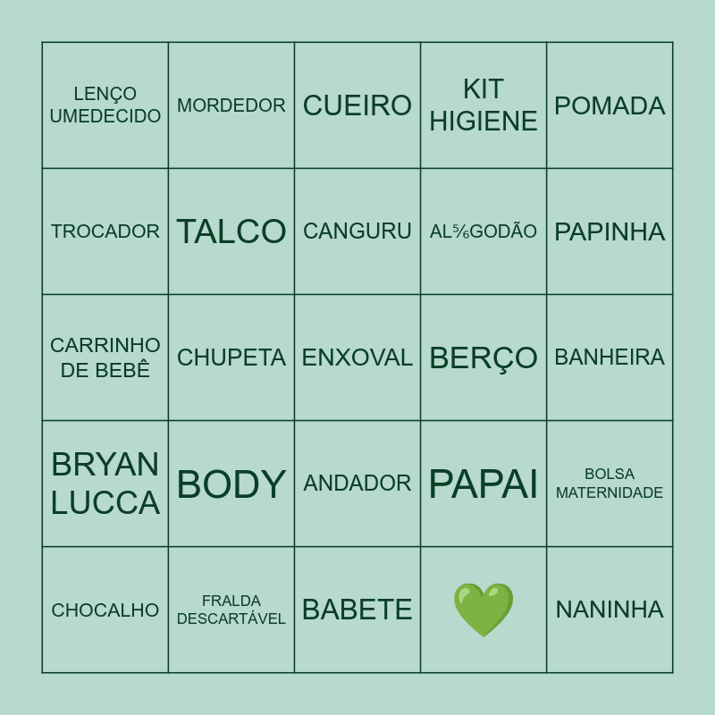 This bingo card has 30 words: FRALDA DESCARTÁVEL, FRALDA DE PANO, CHUPETA, MAMADEIRA, LENÇO UMEDECIDO, CUEIRO, TALCO, ANDADOR, BERÇO, BABETE, BANHEIRA, ENXOVAL, 💚, NANINHA, PAPINHA, MAMÃE, PAPAI, BRYAN LUCCA, BODY, POMADA, CARRINHO DE BEBÊ, SAPATINHO, MORDEDOR, AL⅚GODÃO, TROCADOR, KIT HIGIENE, BOLSA MATERNIDADE, CHOCALHO, CANGURU and ASPIRADOR NASAL.