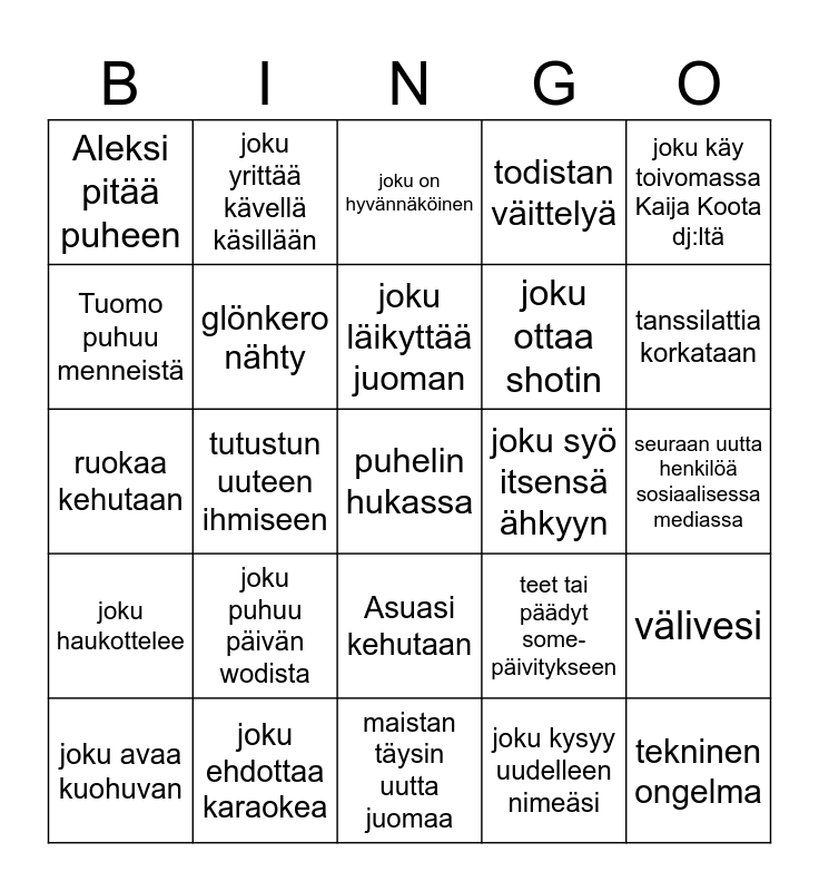 This bingo card has a free space and 24 words: joku puhuu päivän wodista, joku ehdottaa karaokea, joku läikyttää juoman, joku avaa kuohuvan, joku käy toivomassa Kaija Koota dj:ltä, Aleksi pitää puheen, Tuomo puhuu menneistä, joku yrittää kävellä käsillään, joku syö itsensä ähkyyn, Asuasi kehutaan, joku ottaa shotin, ruokaa kehutaan, teet tai päädyt some- päivitykseen, välivesi, glönkero nähty, joku kysyy uudelleen nimeäsi, seuraan uutta henkilöä sosiaalisessa mediassa, joku on hyvännäköinen, tanssilattia korkataan, tutustun uuteen ihmiseen, tekninen ongelma, joku haukottelee, todistan väittelyä and maistan täysin uutta juomaa.
