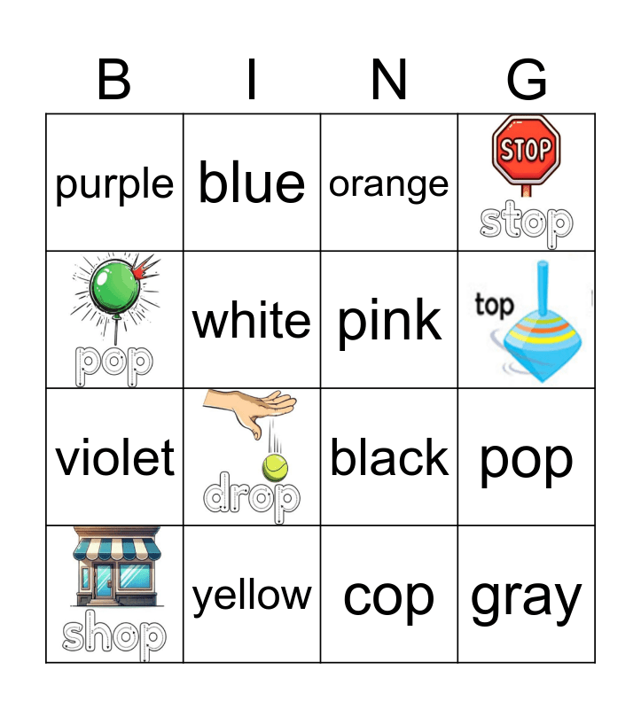 This bingo card has 8 images and 14 words: yellow, red, blue, green, white, pink, purple, orange, black, gray, violet, top, cop and pop.