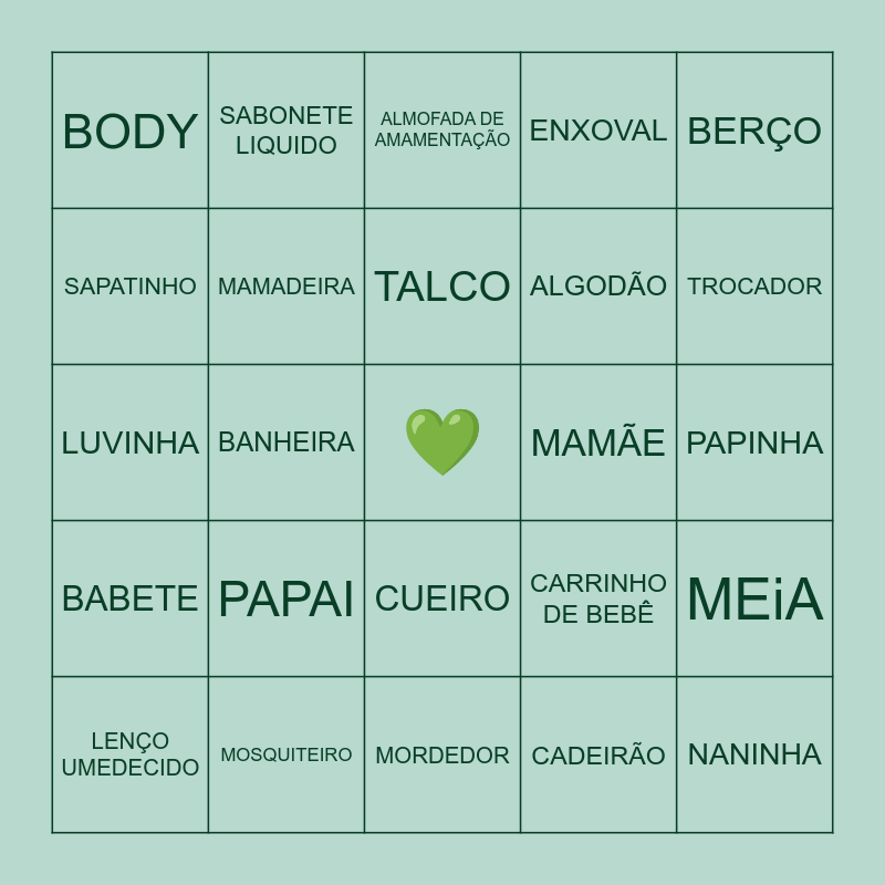 This bingo card has a free space and 39 words: FRALDA DESCARTÁVEL, FRALDA DE PANO, CHUPETA, MAMADEIRA, LENÇO UMEDECIDO, CUEIRO, TALCO, ANDADOR, BERÇO, BABETE, BANHEIRA, ENXOVAL, NANINHA, PAPINHA, MAMÃE, PAPAI, BRYAN LUCCA, BODY, POMADA, CARRINHO DE BEBÊ, SAPATINHO, MORDEDOR, ALGODÃO, TROCADOR, KIT HIGIENE, BOLSA MATERNIDADE, CHOCALHO, CANGURU, ASPIRADOR <NASAL, SABONETE LIQUIDO, SHAMPO, CONDICIONADOR, ALMOFADA DE AMAMENTAÇÃO, MOSQUITEIRO, CADEIRÃO, MIJÃO, MEiA, LUVINHA and MANTA.