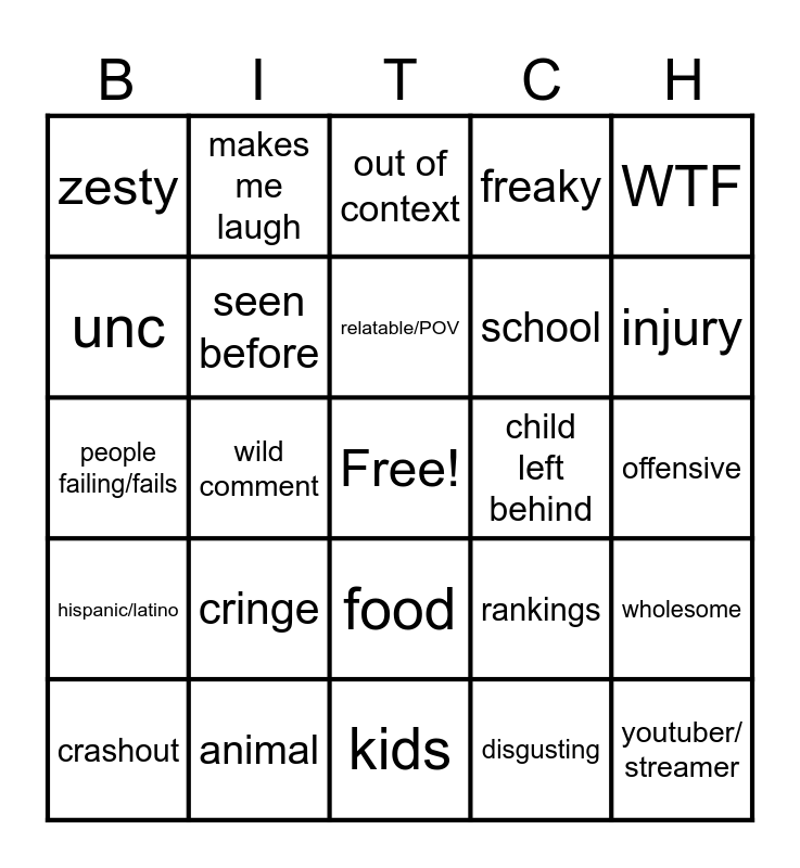 This bingo card has a free space and 24 words: cringe, animal, relatable/POV, crashout, WTF, zesty, unc, makes me laugh, child left behind, food, school, people failing/fails, rankings, wholesome, seen before, disgusting, offensive, out of context, injury, wild comment, youtuber/ streamer, hispanic/latino, freaky and kids.