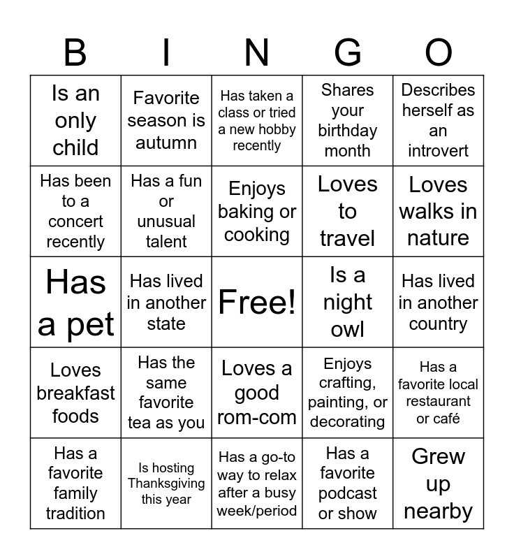 This bingo card has a free space and 24 words: Has the same favorite tea as you, Is hosting Thanksgiving this year, Enjoys baking or cooking, Has a favorite family tradition, Describes herself as an introvert, Is an only child, Has been to a concert recently, Favorite season is autumn, Is a night owl, Loves a good rom-com, Loves to travel, Has a pet, Enjoys crafting, painting, or decorating, Has a favorite local restaurant or café, Has a fun or unusual talent, Has a favorite podcast or show, Has lived in another country, Has taken a class or tried a new hobby recently, Loves walks in nature, Has lived in another state, Grew up nearby, Loves breakfast foods, Shares your birthday month and Has a go-to way to relax after a busy week/period.