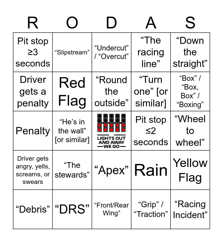 This bingo card has a free space and 38 words: SC/VSC, “Fresh[er] tyres”, “Track temperature”, Red Flag, Yellow Flag, “The stewards”, “Round the outside”, “Tyre Degradation” / “Tyre Wear” [or similar], “Down the straight”, “Turn one” [or similar], “He’s in the wall” [or similar], “The racing line”, “Racing Incident”, “Wheel to wheel”, Driver gets a penalty, Driver gets angry, yells, screams, or swears, “Elbows out”, “Undercut” / “Overcut”, “Lock up”, Pit stop ≤2 seconds, Pit stop ≥3 seconds, “DRS”, “Box” / “Box, Box” / “Boxing”, “Debris”, “Fastest Lap”, “Front/Rear Wing”, “The Chassis”, “Dirty Air” / “Clean Air”, “High speed corner”, “Championship” / “World Champion”, Driver DNFs, “Apex”, “Grip” / “Traction”, “Slipstream”, Victory from Pole, Rain, Penalty and “Chicane”.