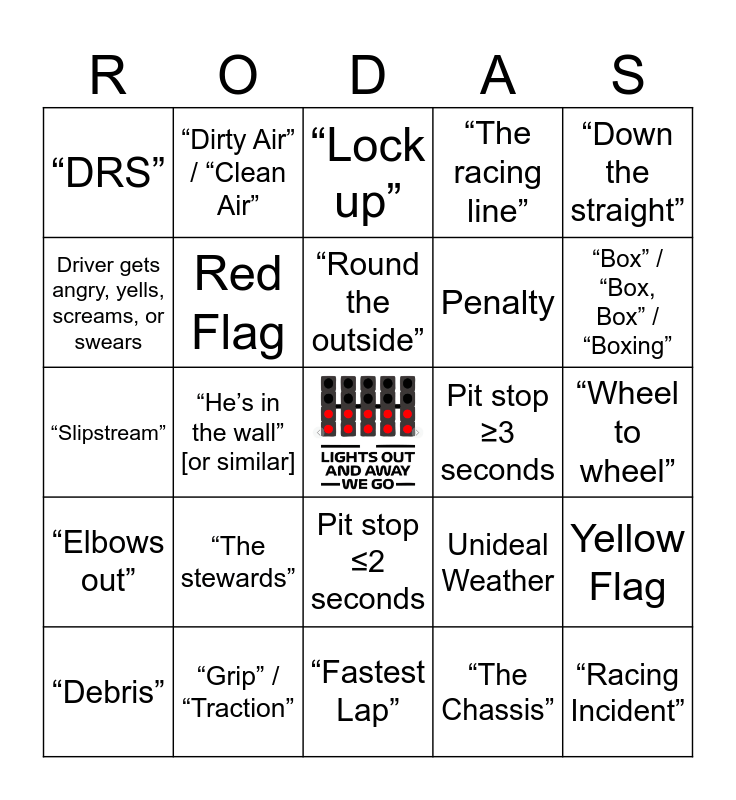 This bingo card has a free space and 37 words: SC/VSC, “Fresh[er] tyres”, “Track temperature”, Red Flag, Yellow Flag, “The stewards”, “Round the outside”, “Tyre Degradation” / “Tyre Wear” [or similar], “Down the straight”, “Turn one” [or similar], “He’s in the wall” [or similar], “The racing line”, “Racing Incident”, “Wheel to wheel”, Driver gets angry, yells, screams, or swears, “Elbows out”, “Undercut” / “Overcut”, “Lock up”, Pit stop ≤2 seconds, Pit stop ≥3 seconds, “DRS”, “Box” / “Box, Box” / “Boxing”, “Debris”, “Fastest Lap”, “Front/Rear Wing”, “The Chassis”, “Dirty Air” / “Clean Air”, “High speed corner”, “Championship” / “World Champion”, Driver DNFs, “Apex”, “Grip” / “Traction”, “Slipstream”, Victory from Pole, Unideal Weather, Penalty and “Chicane”.