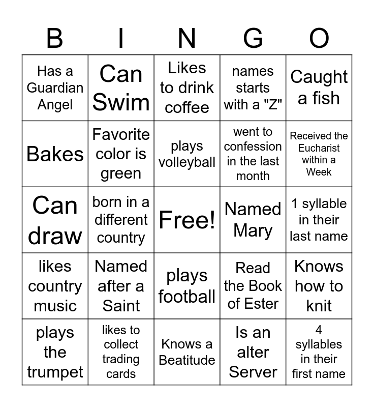 This bingo card has a free space and 39 words: has Traveled outside of the country, has Traveled outside for the state, is the middle child, Favorite color is green, plays the trumpet, plays football, plays volleyball, 3+ siblings, Caught a fish, likes country music, born in a different country, names starts with a "Z", 4 syllables in their first name, 1 syllable in their last name, Named Mary, Named after a Saint, born in Wilmington, Has a Guardian Angel, Read the book of Luke, Read the Book of Ester, Bakes, Knows a Beatitude, went to confession in the last month, Received the Eucharist within a Week, Has made homemade bread, Can cook, Wears a crucifix, prays everyday, Can sing, Can Swim, Was baptized not as a Baby, Has a green thumb, Likes to drink coffee, likes to collect trading cards, Is an alter Server, Likes to eat zucchini, Knows how to knit, Can draw and Has a dog.