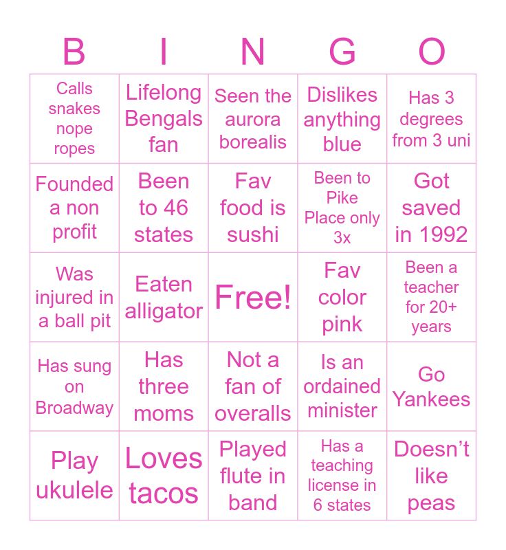 This bingo card has a free space and 29 words: Play ukulele, Lived in 8 countries, Eaten alligator, Can’t ride a bike, Calls snakes nope ropes, Seen the aurora borealis, Been to 46 states, Has three moms, Fav color pink, Loves tacos, Been a teacher for 20+ years, Doesn’t like peas, Played flute in band, Has a teaching license in 6 states, Got saved in 1992, Speaks Spanish, Not a fan of overalls, Has sung on Broadway, Has 3 degrees from 3 uni, Was injured in a ball pit, Is an ordained minister, Loves beach life, Been to Pike Place only 3x, Founded a non profit, Dislikes anything blue, Lifelong Bengals fan, Go Yankees, Fav food is sushi and Loves to cook.