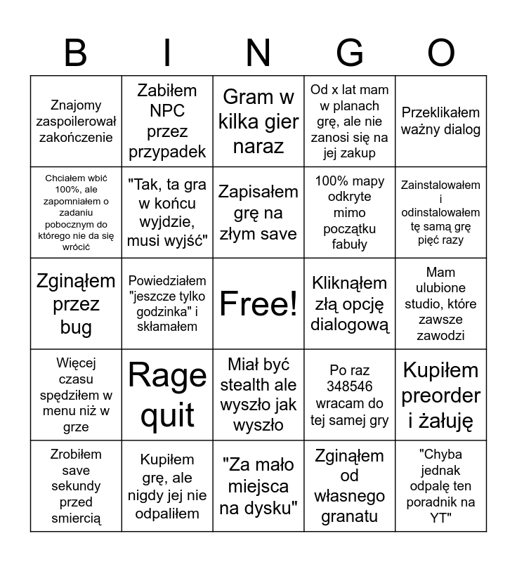 This bingo card has a free space and 24 words: Rage quit, Kupiłem grę, ale nigdy jej nie odpaliłem, Zapisałem grę na złym save, Zrobiłem save sekundy przed smiercią, Przeklikałem ważny dialog, Znajomy zaspoilerował zakończenie, Chciałem wbić 100%, ale zapomniałem o zadaniu pobocznym do którego nie da się wrócić, Zabiłem NPC przez przypadek, Kliknąłem złą opcję dialogową, Miał być stealth ale wyszło jak wyszło, 100% mapy odkryte mimo początku fabuły, Zginąłem przez bug, Po raz 348546 wracam do tej samej gry, Kupiłem preorder i żałuję, "Tak, ta gra w końcu wyjdzie, musi wyjść", Zginąłem od własnego granatu, Mam ulubione studio, które zawsze zawodzi, Gram w kilka gier naraz, Zainstalowałem i odinstalowałem tę samą grę pięć razy, Powiedziałem "jeszcze tylko godzinka" i skłamałem, "Chyba jednak odpalę ten poradnik na YT", Więcej czasu spędziłem w menu niż w grze, Od x lat mam w planach grę, ale nie zanosi się na jej zakup and "Za mało miejsca na dysku".