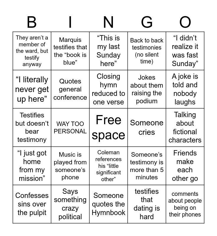 This bingo card has a free space and 24 words: Music is played from someone’s phone, Says something crazy political, Closing hymn reduced to one verse, Confesses sins over the pulpit, “I didn’t realize it was fast Sunday”, They aren’t a member of the ward, but testify anyway, “I literally never get up here”, Marquis testifies that the “book is blue”, Someone cries, Coleman references his “little significant other”, Jokes about them raising the podium, Testifies but doesn’t bear testimony, Someone’s testimony is more than 5 minutes, Friends make each other go, Quotes general conference, testifies that dating is hard, Talking about fictional characters, “This is my last Sunday here”, A joke is told and nobody laughs, WAY TOO PERSONAL, comments about people being on their phones, “I just got home from my mission”, Back to back testimonies (no silent time) and Someone quotes the Hymnbook.