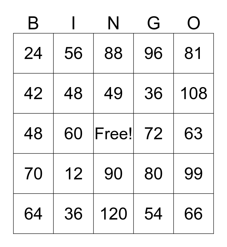 This bingo card has a free space and 24 words: 12, 36, 49, 64, 81, 24, 42, 56, 72, 90, 36, 48, 80, 99, 48, 54, 63, 88, 108, 60, 66, 70, 96 and 120.