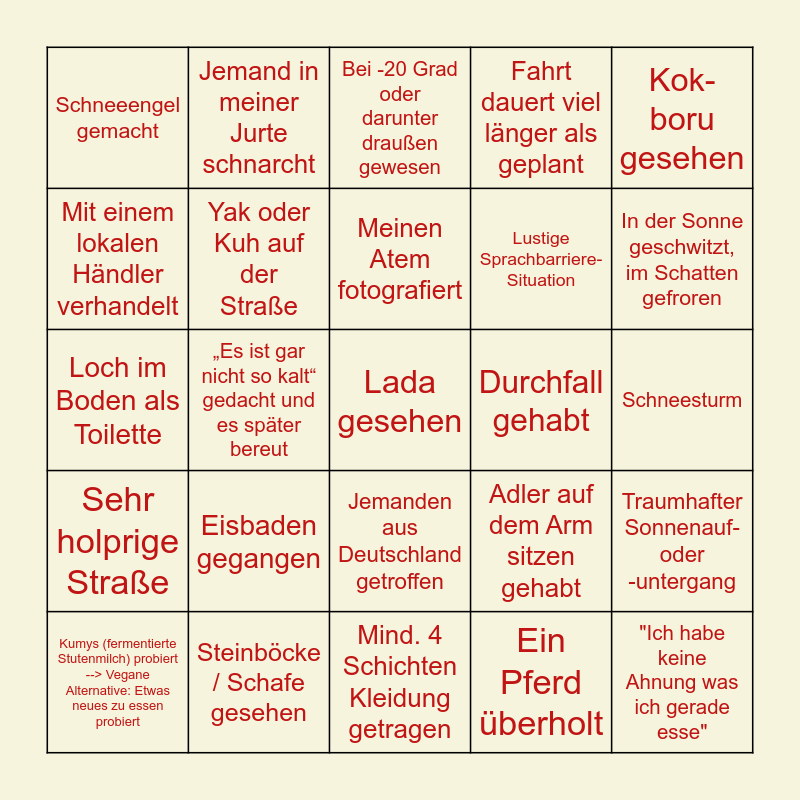 This bingo card has 25 words: Eisbaden gegangen, Mind. 4 Schichten Kleidung getragen, Meinen Atem fotografiert, Kumys (fermentierte Stutenmilch) probiert --> Vegane Alternative: Etwas neues zu essen probiert, Kok-boru gesehen, Schneeengel gemacht, Mit einem lokalen Händler verhandelt, Jemand in meiner Jurte schnarcht, Durchfall gehabt, Jemanden aus Deutschland getroffen, Lustige Sprachbarriere-Situation, Loch im Boden als Toilette, Adler auf dem Arm sitzen gehabt, Traumhafter Sonnenauf- oder -untergang, Yak oder Kuh auf der Straße, "Ich habe keine Ahnung was ich gerade esse", Schneesturm, Bei -20 Grad oder darunter draußen gewesen, In der Sonne geschwitzt, im Schatten gefroren, „Es ist gar nicht so kalt“ gedacht und es später bereut, Lada gesehen, Steinböcke / Schafe gesehen, Sehr holprige Straße, Fahrt dauert viel länger als geplant and Ein Pferd überholt.