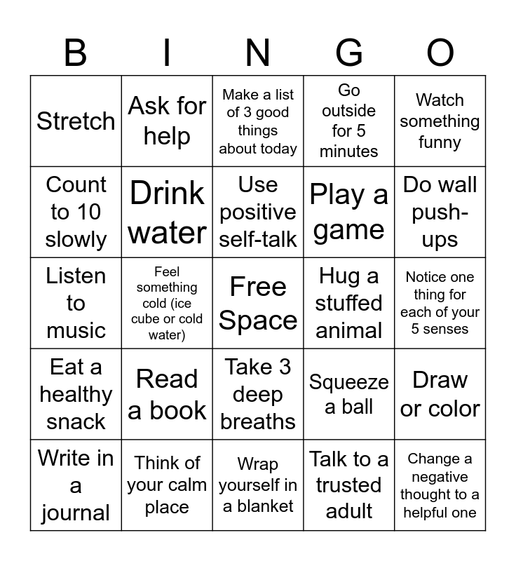 This bingo card has a free space and 24 words: Read a book, Think of your calm place, Use positive self-talk, Write in a journal, Watch something funny, Stretch, Count to 10 slowly, Ask for help, Hug a stuffed animal, Take 3 deep breaths, Play a game, Listen to music, Squeeze a ball, Draw or color, Drink water, Talk to a trusted adult, Notice one thing for each of your 5 senses, Make a list of 3 good things about today, Do wall push-ups, Feel something cold (ice cube or cold water), Change a negative thought to a helpful one, Eat a healthy snack, Go outside for 5 minutes and Wrap yourself in a blanket.