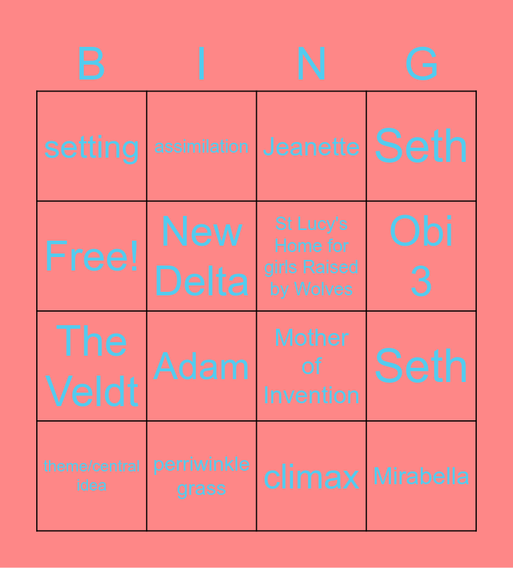 This bingo card has 16 words: perriwinkle grass, Seth, Jeanette, setting, The Veldt, assimilation, Mother of Invention, climax, Free!, New Delta, theme/central idea, Seth, Adam, Obi 3, St Lucy's Home for girls Raised by Wolves and Mirabella.