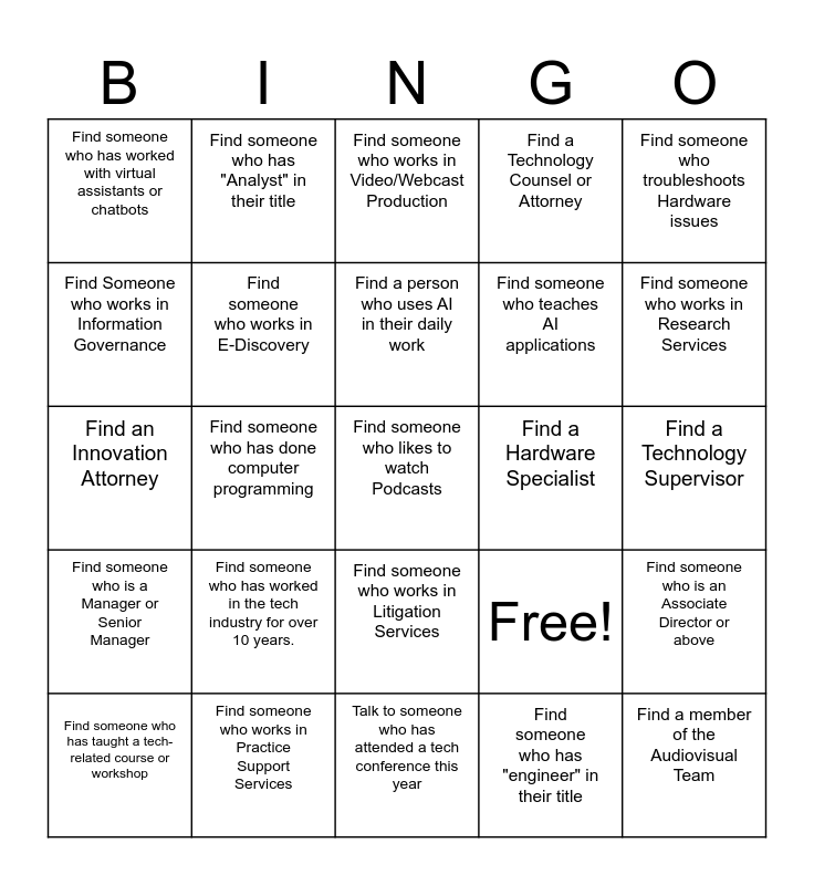 This bingo card has 25 words: Find someone who has worked in the tech industry for over 10 years., Talk to someone who has attended a tech conference this year, Find a person who uses AI in their daily work, Find someone who has taught a tech-related course or workshop, Find someone who troubleshoots Hardware issues, Find someone who has worked with virtual assistants or chatbots, Find Someone who works in Information Governance, Find someone who has "Analyst" in their title, Find a Hardware Specialist, Find someone who works in Litigation Services, Find someone who teaches AI applications, Find an Innovation Attorney, Free!, Find someone who is an Associate Director or above, Find someone who works in E-Discovery, Find a member of the Audiovisual Team, Find a Technology Supervisor, Find someone who works in Video/Webcast Production, Find someone who works in Research Services, Find someone who has done computer programming, Find someone who likes to watch Podcasts, Find someone who works in Practice Support Services, Find someone who is a Manager or Senior Manager, Find a Technology Counsel or Attorney and Find someone who has "engineer" in their title.
