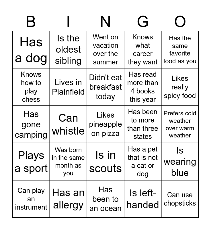 This bingo card has 45 words: Can speak a second language, Likes pineapple on pizza, Is an only child, Can play an instrument, Shares your taste in music, Is left-handed, Went on vacation over the summer, Likes to bake, Has the same favorite food as you, Has an allergy, Knows what career they want, Has been to more than three states, Is in scouts, Was born in the same month as you, Has a hidden talent people don't know about, Has been to an ocean, Went trick or treating, Has gone camping, Is wearing red, Likes really spicy food, Is the oldest sibling, Prefers warm weather over cold weather, Has glasses, Has a dog, Has/had braces, Prefers cold weather over warm weather, Likes camping, Is the youngest sibling, Has a pet that is not a cat or dog, Plays a sport, Is part of a club at WBO, Is wearing blue, Has had a cavity, Has broken a bone, Has social media, Can whistle, Enjoys math, Enjoys science, Can use chopsticks, Didn't eat breakfast today, Knows how to play chess, Has read more than 4 books this year, Has a favorite store, Lives in Plainfield and Lives in Shorewood.