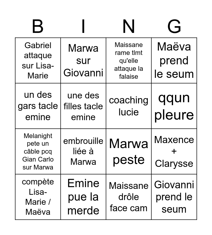 This bingo card has 16 words: Emine pue la merde, Maxence + Clarysse, Maissane rame tlmt qu'elle attaque la falaise, Gabriel attaque sur Lisa-Marie, Melanight pete un câble pcq Gian Carlo sur Marwa, Marwa sur Giovanni, Marwa peste, Maissane drôle face cam, un des gars tacle emine, une des filles tacle emine, compète Lisa-Marie / Maëva, Maëva prend le seum, embrouille liée à Marwa, qqun pleure, coaching lucie and Giovanni prend le seum.