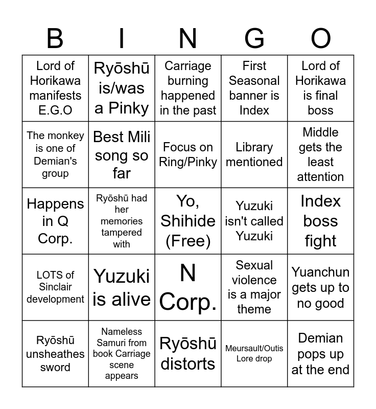 This bingo card has a free space and 24 words: Ryōshū unsheathes sword, Yuzuki is alive, Focus on Ring/Pinky, Meursault/Outis Lore drop, Lord of Horikawa is final boss, Lord of Horikawa manifests E.G.O, Ryōshū is/was a Pinky, Carriage burning happened in the past, Yuzuki isn't called Yuzuki, Index boss fight, Happens in Q Corp., Best Mili song so far, Sexual violence is a major theme, Yuanchun gets up to no good, The monkey is one of Demian's group, Nameless Samuri from book Carriage scene appears, Ryōshū distorts, First Seasonal banner is Index, Middle gets the least attention, LOTS of Sinclair development, Ryōshū had her memories tampered with, N Corp., Library mentioned and Demian pops up at the end.