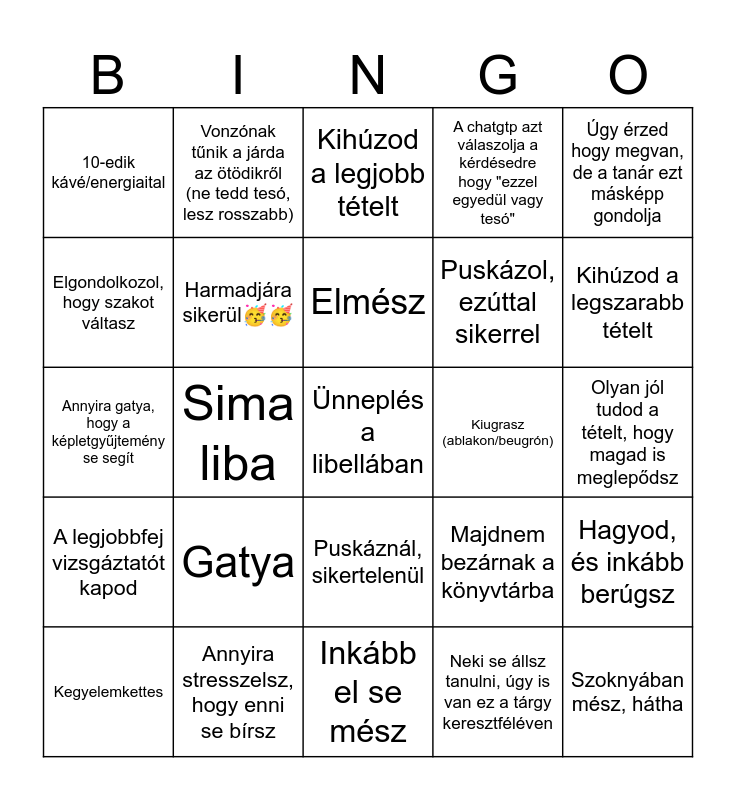 This bingo card has 25 words: Gatya, Inkább el se mész, Elmész, Kegyelemkettes, Úgy érzed hogy megvan, de a tanár ezt másképp gondolja, 10-edik kávé/energiaital, Elgondolkozol, hogy szakot váltasz, Vonzónak tűnik a járda az ötödikről (ne tedd tesó, lesz rosszabb), Kiugrasz (ablakon/beugrón), Puskáznál, sikertelenül, Puskázol, ezúttal sikerrel, Annyira gatya, hogy a képletgyűjtemény se segít, Majdnem bezárnak a könyvtárba, Hagyod, és inkább berúgsz, Harmadjára sikerül🥳🥳, Szoknyában mész, hátha, Olyan jól tudod a tételt, hogy magad is meglepődsz, Kihúzod a legjobb tételt, Kihúzod a legszarabb tételt, Sima liba, Ünneplés a libellában, Annyira stresszelsz, hogy enni se bírsz, A legjobbfej vizsgáztatót kapod, A chatgtp azt válaszolja a kérdésedre hogy "ezzel egyedül vagy tesó" and Neki se állsz tanulni, úgy is van ez a tárgy keresztféléven.
