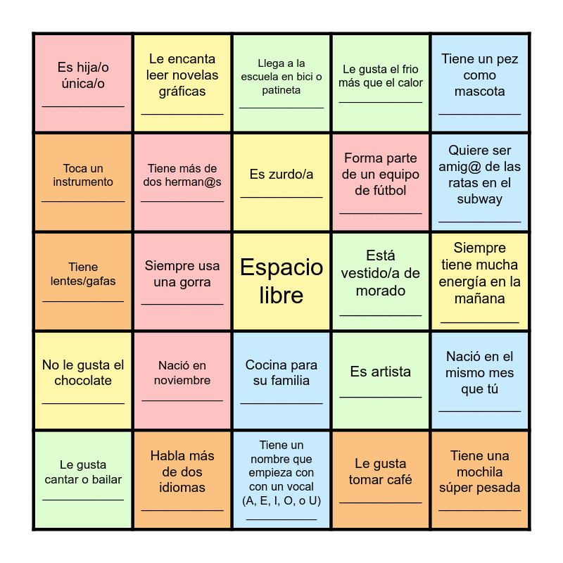This bingo card has a free space and 24 words: Nació en noviembre ____________, Habla más de dos idiomas ___________, Es zurdo/a ___________, Le gusta cantar o bailar ____________, Tiene un pez como mascota ___________, Es hija/o única/o ___________, Toca un instrumento _____________, Le encanta leer novelas gráficas ___________, Está vestido/a de morado __________, Cocina para su familia ___________, Forma parte de un equipo de fútbol ___________, Tiene lentes/gafas ____________, Es artista __________, Nació en el mismo mes que tú ___________, Tiene más de dos herman@s _____________, Le gusta tomar café ___________, Siempre tiene mucha energía en la mañana __________, Llega a la escuela en bici o patineta ______________, Quiere ser amig@ de las ratas en el subway ___________, Siempre usa una gorra ___________, Tiene una mochila súper pesada ___________, No le gusta el chocolate ___________, Le gusta el frio más que el calor _____________ and Tiene un nombre que empieza con con un vocal (A, E, I, O, o U) ___________.
