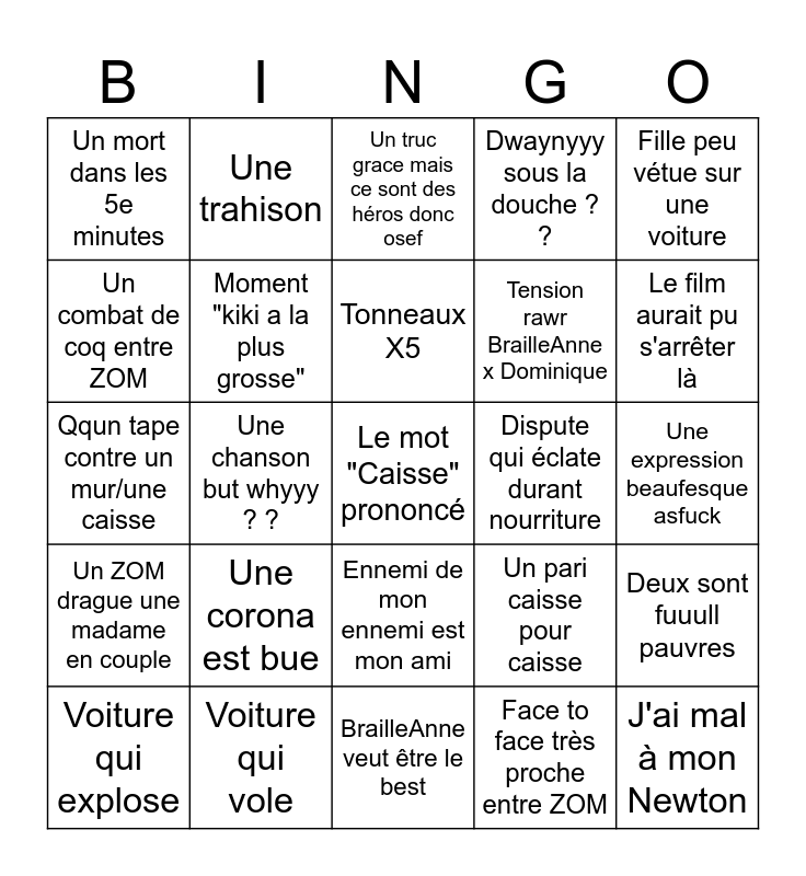 This bingo card has a free space and 24 words: Une corona est bue, Voiture qui vole, Tonneaux X5, Voiture qui explose, Fille peu vétue sur une voiture, Un mort dans les 5e minutes, Un combat de coq entre ZOM, Une trahison, Dispute qui éclate durant nourriture, Ennemi de mon ennemi est mon ami, Tension rawr BrailleAnne x Dominique, Qqun tape contre un mur/une caisse, Un pari caisse pour caisse, Deux sont fuuull pauvres, Moment "kiki a la plus grosse", Face to face très proche entre ZOM, Une expression beaufesque asfuck, Un truc grace mais ce sont des héros donc osef, Le film aurait pu s'arrêter là, Une chanson but whyyy ? ?, J'ai mal à mon Newton, Un ZOM drague une madame en couple, Dwaynyyy sous la douche ? ? and BrailleAnne veut être le best.