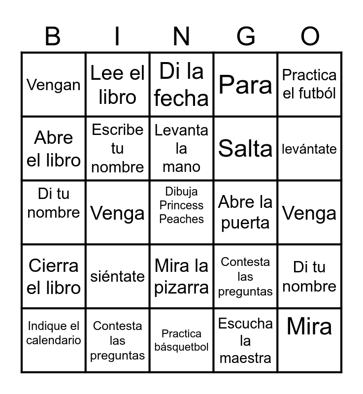 This bingo card has 50 words: Indique la pizarra, Dibuja Princess Peaches, Mira el video, Practica básquetbol, siéntate, Cierra el libro, Lee el libro, Cierra la puerta, Abre el libro, Cierra los libros, Escribe tu nombre, Para, Di tu nombre, Contesta las preguntas, Abre, levántate, Levanta la mano, Abre la puerta, Contesta, Practica el futból, Venga, Escucha la maestra, Vengan, Salta, Baja la mano, Mira, levántate, Salten, Di la fecha, Mira la pizarra, Silencio, Indique el lápiz, Dibuja Elsa, Lee "The 3 little Pigs", Contesta las preguntas, Repita, cierra el chromebook, Abre el chromebook, Para, Venga, Di, siéntate, escribe el mes, siéntate, Indique el calendario, Di tu nombre, Baja la mano, Escribe la fecha, Cierra el libro and Abre el cuaderno.