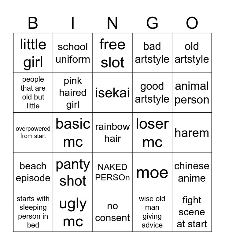 This bingo card has a free space and 24 words: panty shot, ugly mc, isekai, starts with sleeping person in bed, old artstyle, little girl, people that are old but little, school uniform, loser mc, NAKED PERSOn, good artstyle, overpowered from start, moe, chinese anime, pink haired girl, wise old man giving advice, harem, free slot, animal person, basic mc, fight scene at start, beach episode, bad artstyle and no consent.