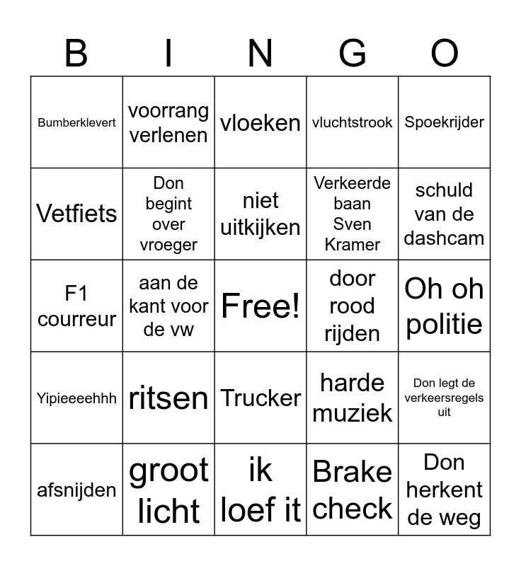This bingo card has a free space and 24 words: ritsen, groot licht, niet uitkijken, afsnijden, Spoekrijder, Bumberklevert, Vetfiets, voorrang verlenen, door rood rijden, Trucker, Verkeerde baan Sven Kramer, F1 courreur, harde muziek, Don legt de verkeersregels uit, Don begint over vroeger, Brake check, Oh oh politie, vloeken, schuld van de dashcam, aan de kant voor de vw, Don herkent de weg, Yipieeeehhh, vluchtstrook and ik loef it.