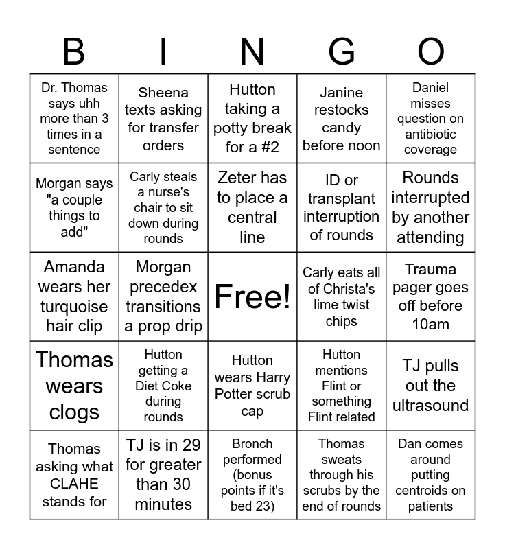 This bingo card has a free space and 24 words: Hutton getting a Diet Coke during rounds, TJ is in 29 for greater than 30 minutes, Zeter has to place a central line, Thomas asking what CLAHE stands for, Daniel misses question on antibiotic coverage, Dr. Thomas says uhh more than 3 times in a sentence, Morgan says "a couple things to add", Sheena texts asking for transfer orders, Carly eats all of Christa's lime twist chips, Hutton wears Harry Potter scrub cap, ID or transplant interruption of rounds, Amanda wears her turquoise hair clip, Hutton mentions Flint or something Flint related, TJ pulls out the ultrasound, Carly steals a nurse's chair to sit down during rounds, Thomas sweats through his scrubs by the end of rounds, Trauma pager goes off before 10am, Hutton taking a potty break for a #2, Rounds interrupted by another attending, Morgan precedex transitions a prop drip, Dan comes around putting centroids on patients, Thomas wears clogs, Janine restocks candy before noon and Bronch performed (bonus points if it's bed 23).