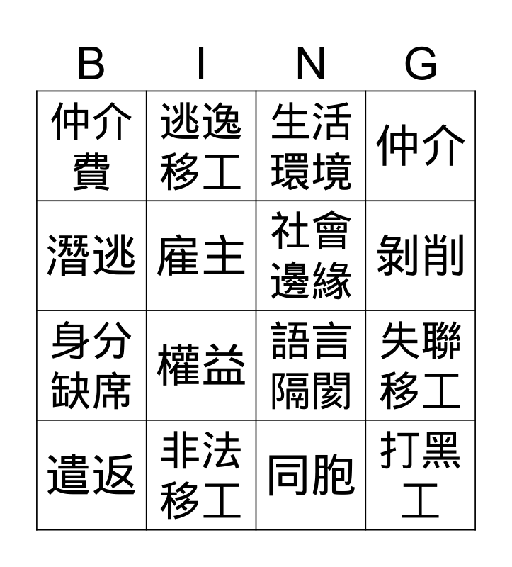 This bingo card has 16 words: 非法移工, 失聯移工, 生活環境, 仲介費, 身分缺席, 逃逸移工, 語言隔閡, 同胞, 潛逃, 雇主, 遣返, 仲介, 權益, 剝削, 社會邊緣 and 打黑工.