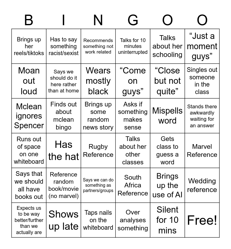 This bingo card has 43 words: Free!, Mclean ignores Spencer, She talks about her husband, Rugby Reference, South Africa Reference, Marvel Reference, Recommends something not work related, Recommends something work related, Talks about her schooling, Talks about her other classes, Talks for 10 minutes uninterrupted, Finds out about mclean bingo, Stands there awkwardly waiting for an answer, Mispells word, Taps nails on the whiteboard, Gets class to guess a word, Wedding reference, “Close but not quite”, Allows to listen to music, “Come on guys”, Has to say something racist/sexist, Expects us to be way better/further than we actually are, Brings up the use of AI, Brings up her reels/tiktoks, Talks about family that isn’t husband, Brings up some random news story, Reference random book/movie (no marvel), Answer a question, Runs out of space on one whiteboard, Asks if something makes sense, Ask a question, Has the hat, Shows up late, Singles out someone in the class, Says we can do something as partners/groups, Over analyses something, Says that we should all have books out, Says we should do it here rather than at home, “Just a moment guys”, Wears mostly black, Silent for 10 mins, Moan out loud and Does our work quicker than us.